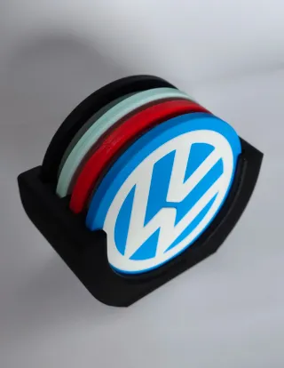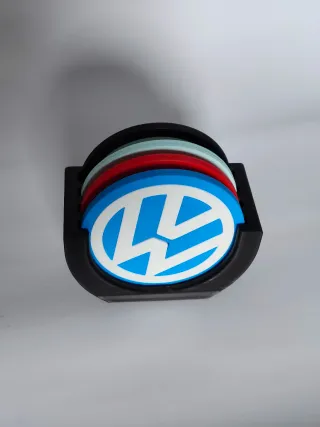 Conjunto de posavasos con el icónico logo de Volkswagen. - Incluye varios posavasos de diferentes colores. - Diseño circular con el logo de VW. - Base negra para almacenarlos.