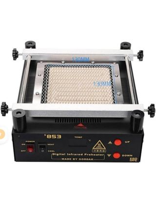 Estación de precalentamiento infrarrojo digital modelo 853. - Diseño compacto y robusto. - Panel de control con pantalla digital. - Ajustes de temperatura (frío y calor)y tiempo. - Fabricado por GORDAK. Precalentador Infrarrojo Digital Gordak 853. Es una herramienta diseñada para precalentar placas de circuito impreso (PCB) y componentes pequeños antes de soldar o desoldar, facilitando el trabajo y evitando daños por calor. Cuenta con controles digitales de temperatura y una superficie de calentamiento infrarrojo segura. El dispositivo incluye una rejilla de protección metálica y soportes ajustables para sujetar las placas.