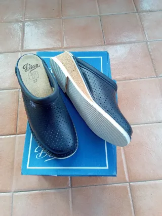 Zuecos de piel negros, talla 37. - Diseño perforado. - Marca Dian. - Calzado laboral anatómico.