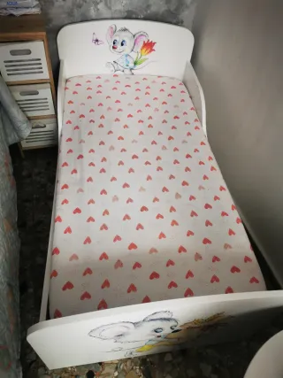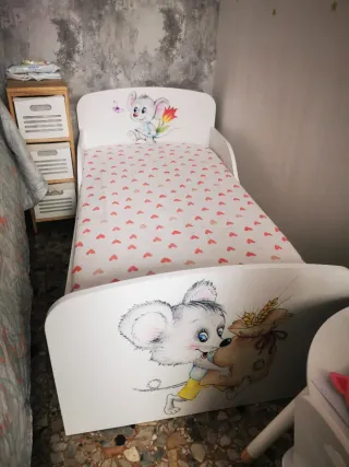 Cama infantil 70×160 con un diseño encantador y original, perfecta para habitaciones de niños. - Dibujos de ratones y flores. - Estructura blanca. - Incluye colchón. -Un cajón con ruedas