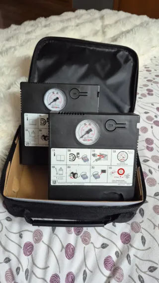 Se venden dos compresores de aire de la marca Aircom para coche. - Incluye dos unidades. - Cada compresor tiene un manómetro para medir la presión. - Vienen en una bolsa de transporte con cremallera. -Montados por grupo vag y porsche