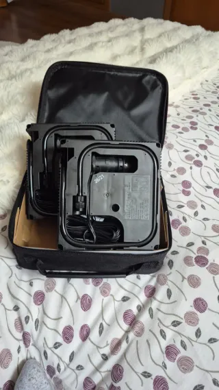 Compresor de aire eléctrico para coche, con manómetro integrado. - Incluye bolsa de transporte. - Compatible con vehículos Audi, Seat y Volkswagen. - Indicaciones visuales para su uso.