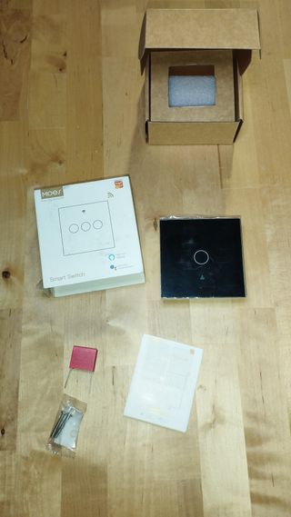 interruptor inteligente MoesGo compatible con la plataforma Tuya. Tecnología: Funciona mediante Wi-Fi (2.4 GHz) y es compatible con asistentes de voz como Alexa y Google Assistant. Diseño: Es un interruptor táctil con panel de cristal templado. Instalación: Puede instalarse sin necesidad de cable neutro utilizando el condensador incluido en la caja. Funcionalidades: Permite el control remoto desde el teléfono móvil a través de la aplicación Tuya Smart o Smart Life.