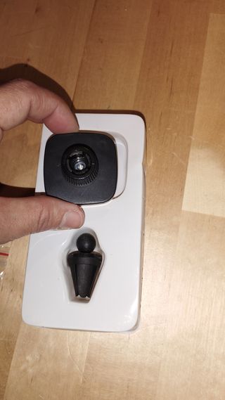soporte magnético para teléfono móvil diseñado para utilizarse en el automóvil. Marca: Gloria. Modelo: BY-02. Tipo: Soporte magnético con pinza para rejilla de ventilación. Característica: Rotación de 360 grados. Incluye placas metálicas adhesivas para fijar el teléfono al imán.