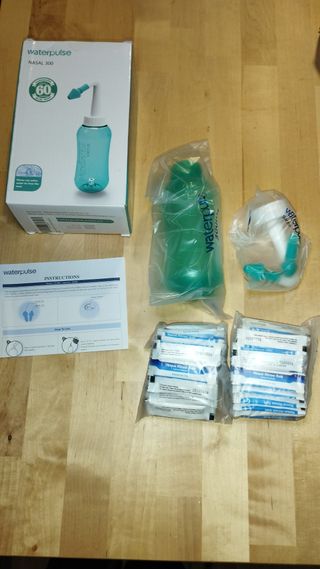 Irrigador nasal Waterpulse Nasal 300. - Botella de plástico. - Boquilla. - Paquetes de sal para enjuague nasal.