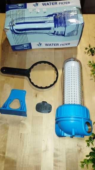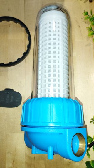 Se vende filtro de agua completo, listo para instalar. Incluye todos los accesorios visibles en la foto. - Cuerpo del filtro transparente. - Base y tapa en color azul. - Llave para apertura y cierre. - Soporte de montaje azul. - Filtro interior blanco.