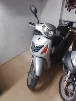 Scooter Honda SH 150 en color plata. - Diseño moderno y elegante. - Espejo retrovisor. - Rueda delantera visible.