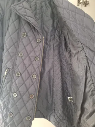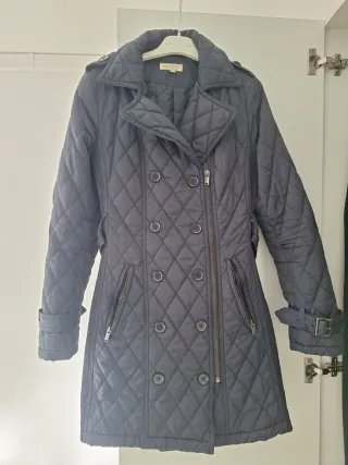 Abrigo acolchado de estilo clásico. Talla S, perfecta hasta talla 40. - Diseño cruzado con botones. - Cremalleras decorativas en los bolsillos.
