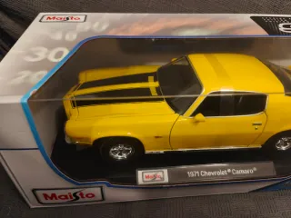 Réplica a escala 1:18 del Chevrolet Camaro de 1971 de Maisto. Este modelo presenta un llamativo color amarillo con franjas negras. - Modelo: Chevrolet Camaro - Año: 1971 - Escala: 1:18 - Marca: Maisto - Color: Amarillo con franjas negras