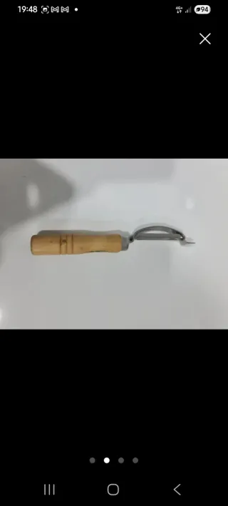 Pelador de verduras con mango de madera y hoja de metal. - Mango de madera. - Hoja de metal.