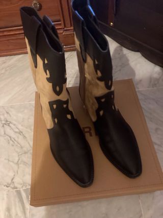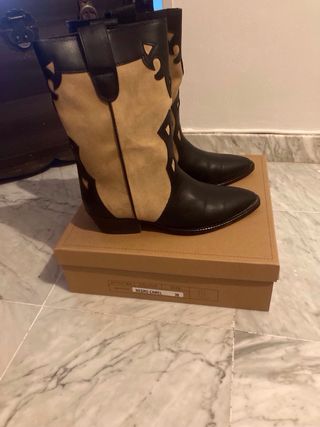 Botas de estilo cowboy con un diseño bicolor. - Combinación de ante beige y piel negra. - Detalle de cortes decorativos en la caña. - Punta afilada. - Caña alta.