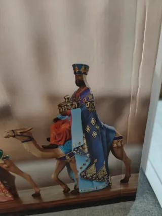 Figura decorativa de los Reyes Magos con camellos. - Representación de los tres Reyes Magos. - Figuras montadas sobre camellos. - Detallado diseño de vestimentas y adornos.