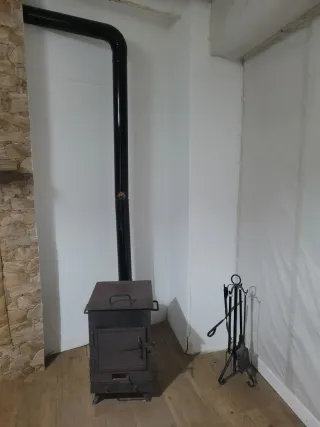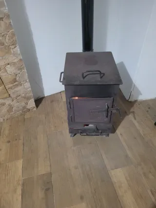 Estufa de leña con un diseño robusto y funcional. - Fabricada en metal resistente. - Acabado en color negro y detalles en marrón. Negociable