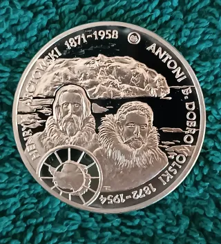 Moneda de 10 Zloty de plata conmemorativa de exploradores polacos. - Diseño detallado de Henryk Arctowski y Antoni B. Dobrowolski. - Representación de paisajes polares y el continente antártico. - Año de emisión: 1871-1958 y 1872-1954. Precio según valoración de pagina numista. Tags; oro, plata, eagle, polonia, panda, libertad, canguro, britania, euro