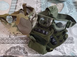 Conjunto de equipo para airsoft que incluye máscara, gafas y guantes. - Máscara con diseño de camuflaje. - Gafas de protección transparentes. - Guantes tácticos verdes. de obsequio, un chaleco y cinturón de primera línea color tan