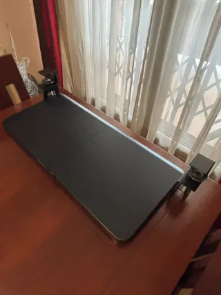Bandeja para teclado bajo escritorio de 65 × 30 cm y un ancho total de 76 cm incluyendo las abrazaderas. Cuenta con un sistema deslizante que permite extenderla hasta 20 cm desde el borde del escritorio. Se fija mediante abrazaderas en C ajustables, compatible con tableros de hasta 40 mm de grosor. Soporta una carga máxima de 5 kg. Su instalación es sencilla, sin necesidad de taladrar. Estado como nuevo No incluye la caja. Precio NO negociable.