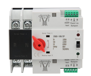 Interruptor automático de potencia ZGQ5-100/2P. por ejemplo sirve para el cambio automatico del suministro de corriente de la red elecrica y de un generador, tambien entre sistemas de placas solares con bateria y la red electrica, se sumistra nuevo en su embalaje original y con manual de montaje - Modelo: ZGQ5-100/2P - Corriente nominal (In): 100A - Tensión nominal (Ue): 220V - Tensión de aislamiento (Ui): 690V - Tensión de impulso (Uimp): 8kV - Frecuencia: 50/60Hz - Alimentación: AC220V - Modo de operación: Manual/Automático
