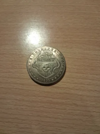 Moneda conmemorativa de Harley Davidson. - Diseño con calavera y alas. - Inscripción MOTOR CYCLES. - Año 1893.