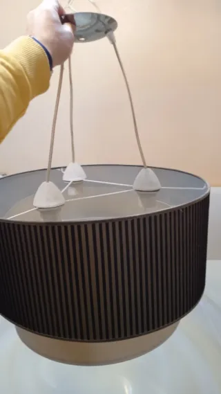 Elegante lámpara de techo con un diseño contemporáneo. - Pantalla de tela con detalles de rayas verticales. - Estructura metálica y detalles en plástico.
