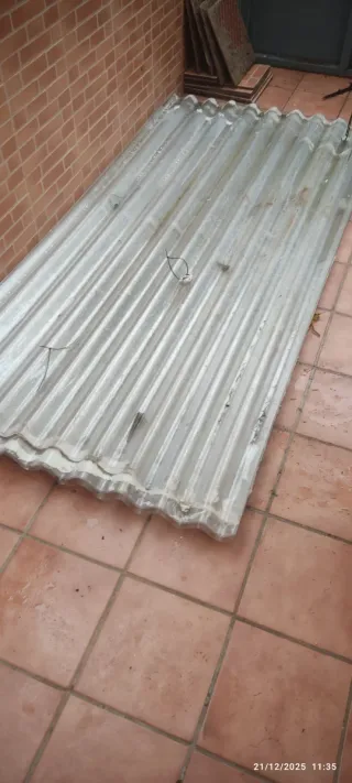 Se venden placas de policarbonato ondulado que costaron 246€. No están taladradas, tienen restos de Sikaflex que es con lo que las use pero se despega si se tira por el sol. Perfectas para quien lo necesite o algún proyecto. Es de 8-12 porque compré 12 pero algunas están recortadas, por lo que no sé cuántas al final serán útiles. - Medidas: 0,95 metros de ancho por 2 metros de largo. - Material: Policarbonato. - Forma: Ondulada.