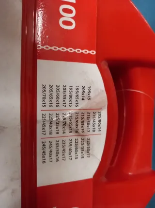 Cadenas para nieve Snovit E-9 NEO, modelo 100. - Grosor de 9mm. - Homologación TUV. - Peso neto: 2,04 kg. - Peso bruto: 3,25 kg. - Compatibles con varios tamaños de neumático (ver listado en imagen).