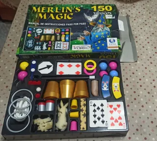 Juego de magia Merlin's Magic con 150 trucos. - Incluye manual de instrucciones paso a paso. - Contiene diversos accesorios para realizar los trucos, como vasos, aros, cartas y figuras. - Caja original incluida.
