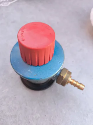 Regulador de presión para gas con salida libre. Ideal para conectar a bombonas de gas. - Cuerpo metálico azul. - Tapón de rosca rojo. - Incluye conexión para manguera.