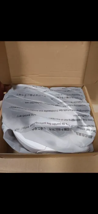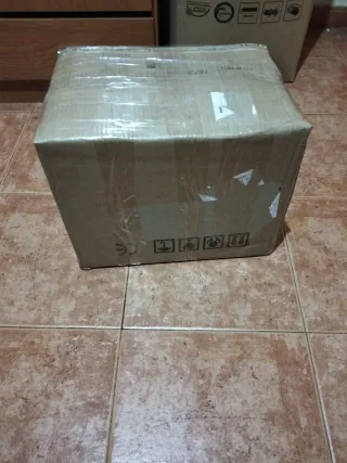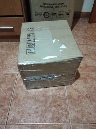 Lote de artículos para Carmen. - Caja de cartón con embalaje de plástico transparente. - Símbolos de manipulación y certificación CE visibles en la caja.