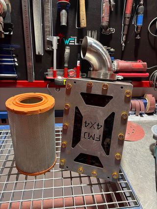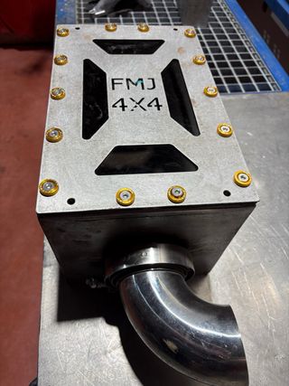 Caja de filtro de alto flujo para vehículos 4x4. - Fabricada en metal. - Diseño con logo FMJ 4x4. - Incluye codo de admisión.entrada diametro 90 ,salida diametro 79 ,opcion a poder cambiar medidas,acero al carbono ecdpto el codo y brida que es inox,