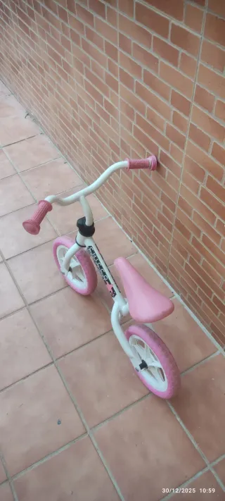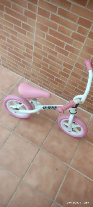 Bicicleta de equilibrio para los bebes que empiezan a andar o niños que puedan seguir usándola. Tiene un roce porque se me resbaló recientemente pero está completamente nueva, un regalo perfecto para los peques. Abierto a ofertas, lo importante es que se le siga dando uso y diversión. - Ruedas de color rosa. - Asiento acolchado rosa. - Marco blanco.