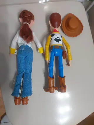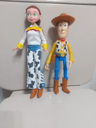 Set de muñecos de los personajes Woody y Jessie de Toy Story. - Muñeco Woody con traje de sheriff. - Muñeca Jessie con traje de vaquera. - Ideal para coleccionistas y fans de la saga.