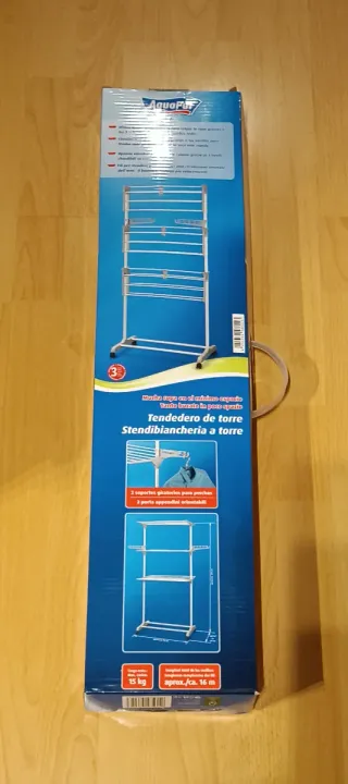 Tendedero de torre de la marca Aquapur, ideal para optimizar el espacio de secado. Nuevo sin estrenar. - Capacidad de carga de 15 kg. - Aproximadamente 16 metros de tendido. - Incluye 2 soportes laterales para perchas. - Tiene ruedas para facilitar su desplazamiento. - Sólo venta en persona.