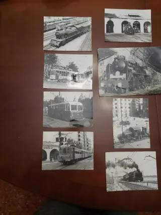 Conjunto de fotografías antiguas de trenes y tranvías. - Imágenes de locomotoras de vapor. - Vistas de tranvías urbanos. - Fotografías de estaciones y vías.
