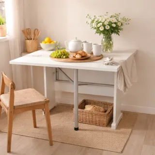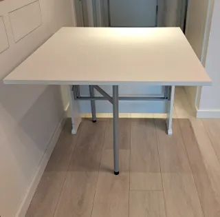 Mesa plegable de cocina, ideal para espacios reducidos. Diseño funcional. - Patas metálicas resistentes. - Tablero de madera lacado en blanco. - Dimensiones de los tableros abatibles: 67 × 79
