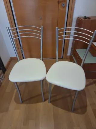 Conjunto de dos sillas para cocina o comedor. Su diseño moderno combina con cualquier estilo. - Estructura de metal plateado. - Asiento y respaldo en piel sintética blanca.