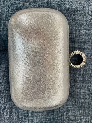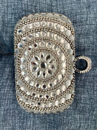 Elegante bolso de mano para eventos especiales, con un diseño llamativo y sofisticado. - Adornado con pedrería y cristales. - Asa circular a juego. - Acabado plateado brillante.