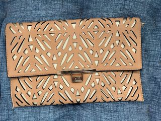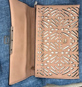 Elegante bolso de mano con un diseño moderno y sofisticado. - Acabado en color beige y rosa. - Diseño calado con patrón geométrico. - Cierre metálico frontal.