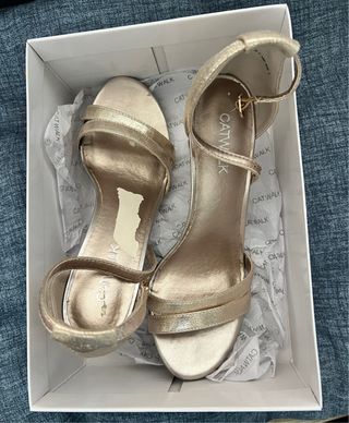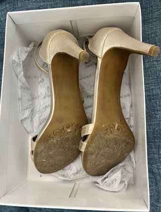 Elegantes sandalias de tacón con un acabado brillante. - Diseño de tiras finas. - Cierre de hebilla en el tobillo. - Tacón de aguja. Algo de desgaste en la parte de la plantilla de uno de los zapatos pero no afecta al uso.