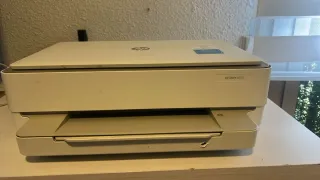 Impresora multifunción HP ENVY 6000 Series en color blanco y gris. - Ideal para uso familiar. - Ofrece impresión, escaneo y copiado. - Compatible con HP Instant Ink.