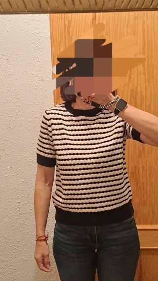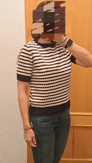 Jersey de manga corta con un diseño de rayas clásico y elegante. - Tejido con textura. - Cuello redondo. - Puños y cuello en contraste.