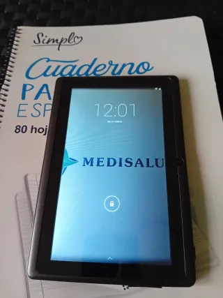 Tablet con pantalla de 7 pulgadas. - Diseño en color negro. - Logo de Medisalu en pantalla.