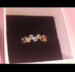 Elegante anillo con circonitas de colores engarzadas en oro. - Diseño ondulado. - Variedad de gemas coloridas. Precioso anillo bañado en oro 18kt con circonitas incrustadas de colores Ideal para regalar Es ajustable, ideal para todo tipo de tallas Es de acero inoxidable Viene con la cajita rosita 🥰❤️ Sin uso Mejor si te lo envio