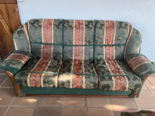 Conjunto de mobiliario de interior: - Un sofá de tres plazas. - Dos butacas individuales. - Tapicería con diseño de rayas y motivos florales. - Estructura de madera vista en los brazos y base.