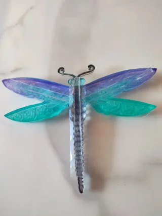 Preciosa libélula decorativa hecha a mano con resina epoxi y tinta luminiscente. Viene con cinta doble cara para pegarla en el sitio deseado. Precioso decoración o regalo para alguien especial . - Diseño detallado y delicado. - Tonos azules y violeta iridiscentes. - Ideal para colgar o decorar. - Pieza única de artesanía.