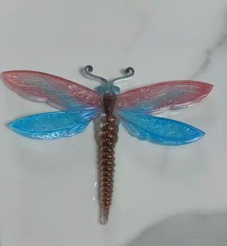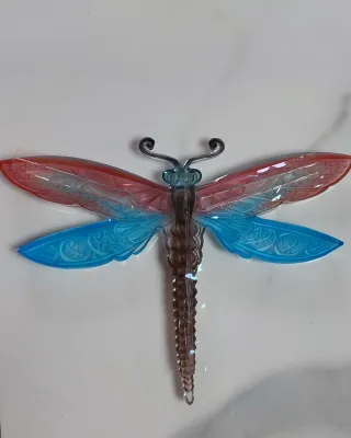 Preciosa libélula decorativa hecha a mano con resina epoxi y tinta luminiscente. Precioso detalle regalo para alguien especial. Viene con cinta doble cara para pegarla en sitio deseado - Diseño único con alas en tonos rojos y azules. - Cuerpo detallado en color bronce. - Ideal para colgar o decorar cualquier espacio.