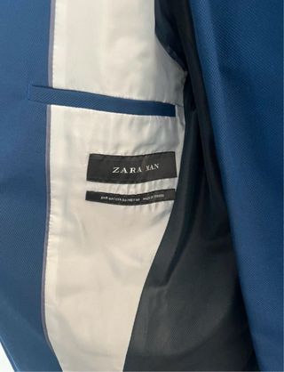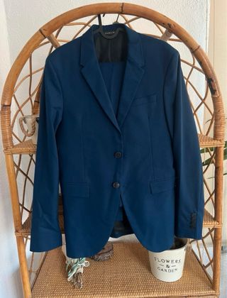 Elegante traje de chaqueta de la marca Zara. - Chaqueta de corte moderno. - Pantalón a juego. - Color azul marino.