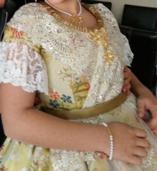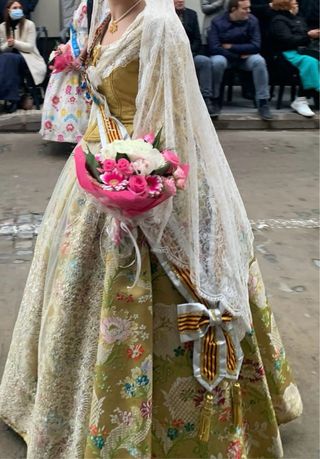 Traje de fallera, seda color oro/mostaza, se vende cuerpo de manga larga y del siglo 19 ambos sin manteletas, la falda también se vende sin manteleta. Altura 1'60 cm.