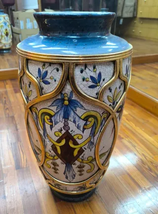 Elegante jarrón de cerámica con detalles en dorado. - Acabado brillante en la parte superior. - Motivos florales y ornamentales - Base con un borde oscuro. - Mide unos 60 cm de alto aprox