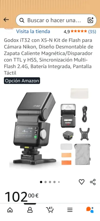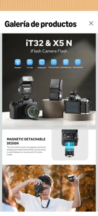 Kit de flash Godox iT32 con disparador X5-N diseñado para cámaras Nikon. Incluye diseño desmontable de zapata caliente magnética. - Soporte para TTL y HSS. - Sincronización Multi-Flash 2.4G. - Batería integrada. - Pantalla táctil.