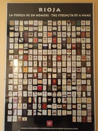 Cuadro de lámina con las etiquetas de distintos vinos con la denominación de origen de Rioja. Lámina protegida con cristal. Sin marco. Medidas 100(alto)x70(ancho) Recoger en casa